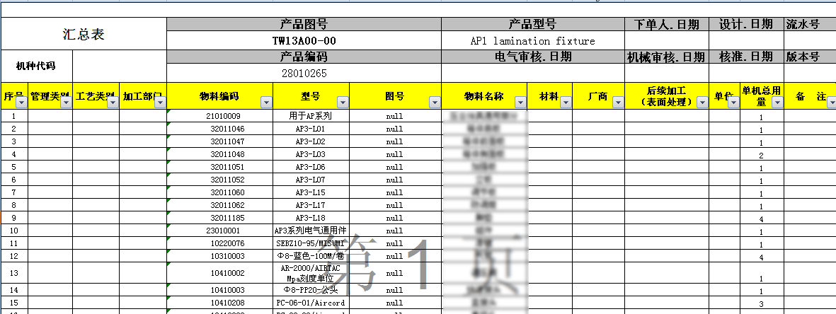 物料匯總表: