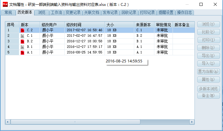 3、各類文檔均可能單獨(dú)查詢歷史版本、變更記錄、打印記錄、回收記錄、執(zhí)行的流程以及詳細(xì)的操作日志,便于追溯文件的各類活動(dòng)軌跡。