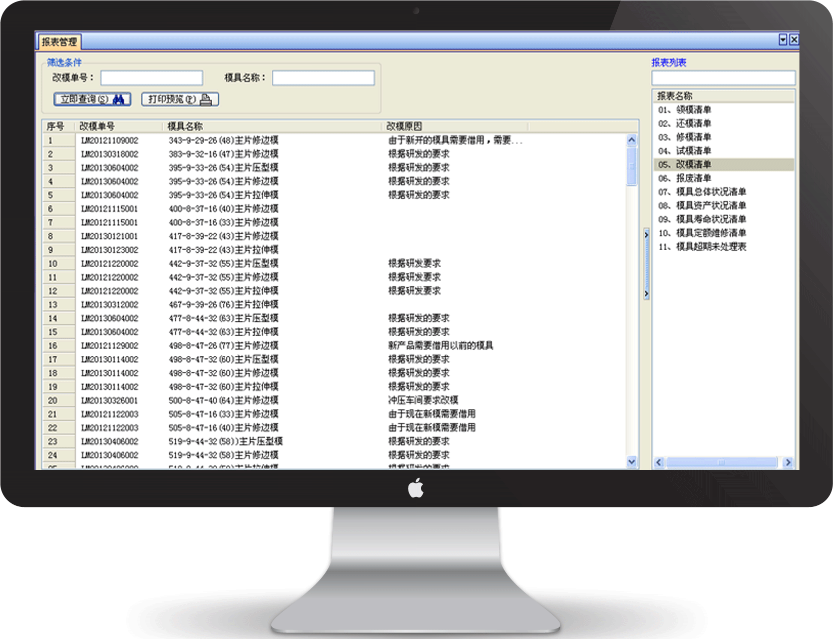 提供模具的基本信息、模具資產(chǎn)狀況、壽命狀況、維修計(jì)劃及其執(zhí)行情況等的查詢與跟蹤,并根據(jù)需要導(dǎo)出報(bào)表。
