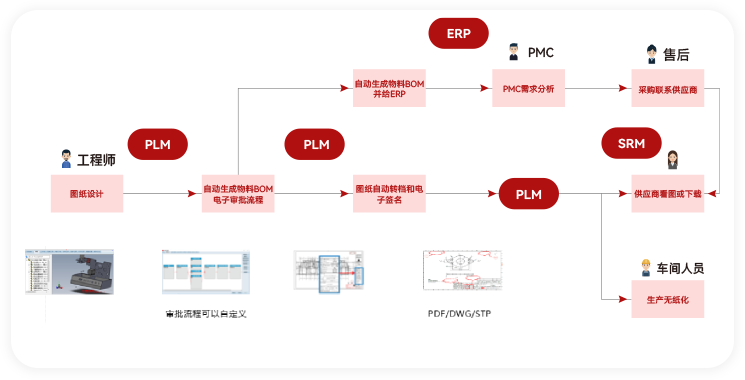 與CAD/CAPP/ERP/MES/CRM/SRM/OA等系統(tǒng)無(wú)縫集成,將各系統(tǒng)中的共同信息提取出來(lái),實(shí)現(xiàn)各個(gè)系統(tǒng)在數(shù)據(jù)級(jí)上的集成,保證數(shù)據(jù)一次性輸入,多次重用。